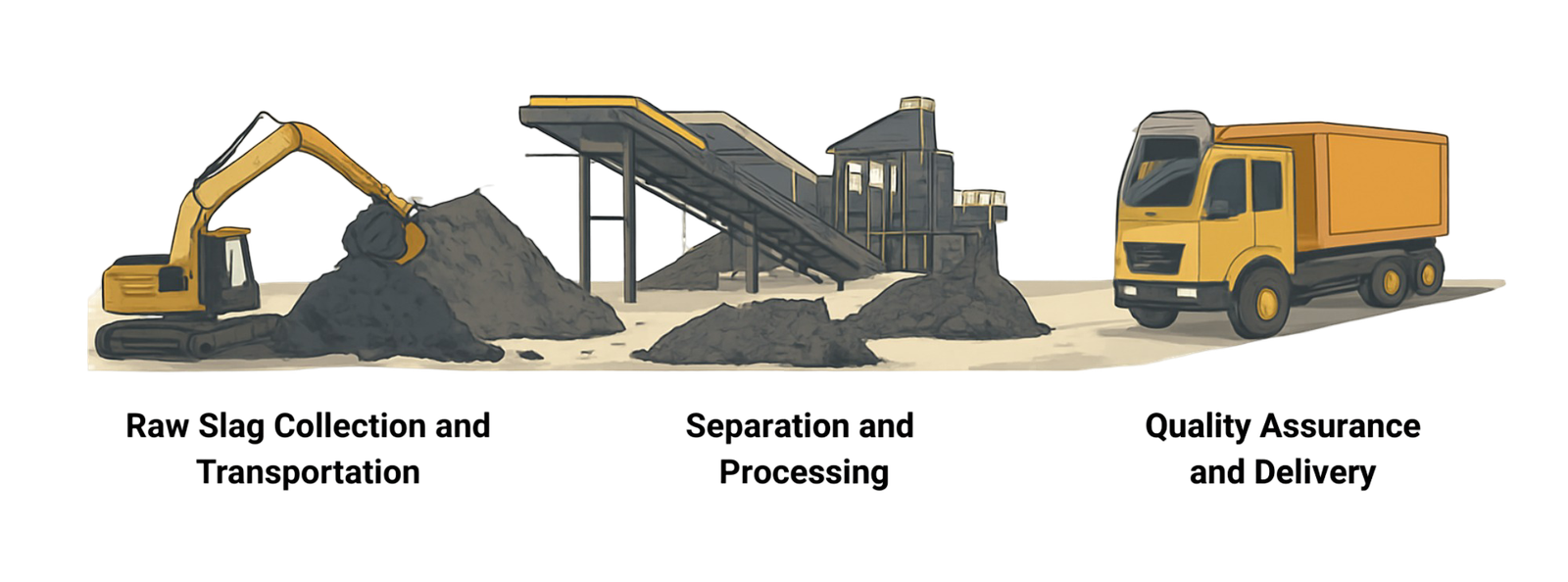 At Ecoslag, we follow a systematic process to maximize resource recovery and minimize environmental impact. From safe slag collection to advanced processing and certified delivery, every step is guided by innovation, responsibility, and sustainability.